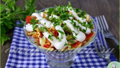 5. Заправку вылить в салатник и аккуратно перемешать. Если время позволяет, можно оставить салатик в холодильнике на некоторое время, чтобы овощи пропитались заправкой.