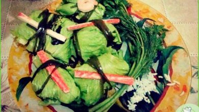 - При подаче на стол салат укладываем горкой в салатницу и посыпаем молотыми грецкими орехами.