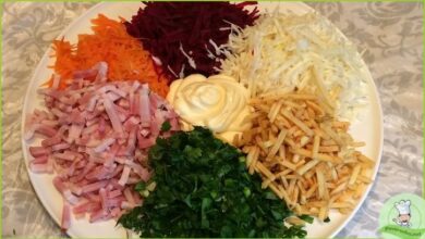 Теперь приступаем к формированию салата. Для этого на блюдо выкладываем свеклу, затем промазываем ее майонезом. После свеклы выкладываем морковь и все остальные ингредиенты по очереди, помазывая каждый слой майонезом.