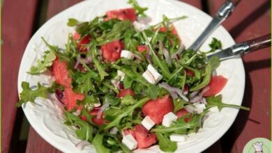 Добавить чернику, разложить салат на порции, посыпать каждую порцию сыром фета и подавать.